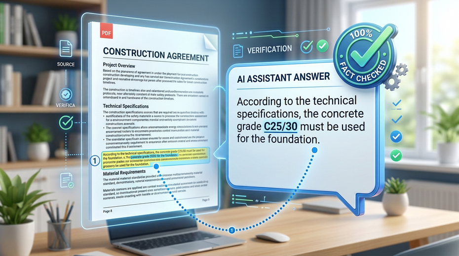 Jeder Bauleiter und Projektsteuerer kennt es: Die Antwort auf eine kritische Frage – sei es zur Bodenbeschaffenheit, zu einer spezifischen LV-Position oder einer Vertragsstrafe – versteckt sich irgendwo in einem Berg aus PDFs, Scans und E-Mails – oder gar Papier.